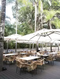 🏠Environment: The exterior is a white glass cabin design, and the interior decoration is mainly European style. On one side, there are large floor-to-ceiling glass windows with pure white curtains, where you can enjoy the view of the waterfall and lake⛲️. Under the direct sunlight, the lake surface is sparkling and the photo opportunities are first-rate. The walls are covered with patterned wallpaper, which looks elegant. There is a bar area in the middle, and passing through this area will take you to the outdoor garden seating area, which has sun umbrella seats or giant birdcage seats. Under the tall palm trees🌴, it has a very vacation-like atmosphere.