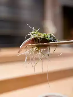 The red tilefish from Fukui Prefecture is first burned with a blowtorch until the skin turns golden, and then smoked with applewood. It is recommended to eat it immediately after lifting the lid, so that the applewood aroma can be fully absorbed by the fish. The red tilefish melts in the mouth, and the full-bodied fish oil and sauce slowly drip onto the cucumber shreds below, providing a comprehensive taste.