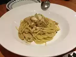 The garlic porcini pasta is rich in porcini flavor and relatively soft. 🍝 also seasons it with black pepper and garlic flakes, adding a rich and multifaceted flavor. The pasta is also very textured, and 😙cooked just right, leaving it feeling crispy.