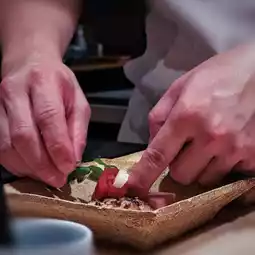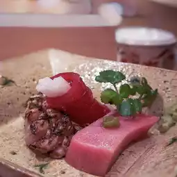 The tuna has three parts: Nakatoro, Akami, and Otoro. Nakatoro is topped with mustard pickles, which is refreshing and spicy. Akami is rolled with fresh Japanese yam and soy sauce, marinated for ten minutes to absorb the soy sauce's aroma, while the yam brings a bit of sweetness and crispness. Otoro is seared to bring out the oil's fragrance, and the meat is tender and juicy. These three parts showcase the different flavors and textures of tuna, allowing people to taste the essence of tuna at once.