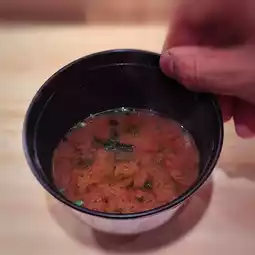 The soup is Akamiso soup made with red Japanese miso, which is rich and salty. There are tofu and vegetables inside, adding nutrition and richness. This soup is a great accompaniment to balance the previous dishes and warm the stomach.