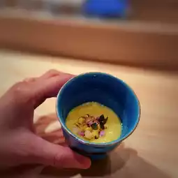 The first dish is a cold soup made with yellow corn, which is sweet and smooth. The milk and sheep's milk jelly inside are soft and dense, creating an interesting contrast in texture and taste.