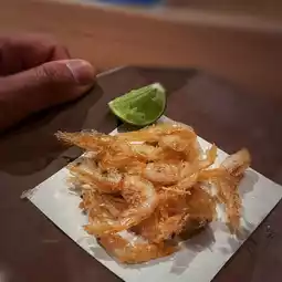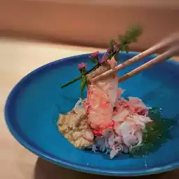 The Toyama prefecture shrimp is prepared using the Karaage method, which gives it a crispy outer layer and juicy and sweet inside. The Hokkaido hairy crab with Tosa vinegar jelly is sour and appetizing. The perilla flower adds a touch of fragrance.