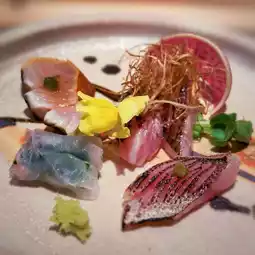 There are four types of sashimi, including aged Akahata, smoked saury, seared black rockfish, and bamboo skewered fish wrapped in seaweed. Each sashimi has its own unique characteristics. Akahata has a thick and rich texture with a hint of ocean flavor when wrapped in seaweed. The smoked saury has a light woody aroma, and the addition of scallions and garlic enhances the flavor. The seared black rockfish is rich in oil and has a crispy texture with refreshing Kyoto scallion on top. The bamboo skewered fish is paired with yuzu pepper to add a bit of spiciness.