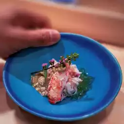 Two types of sea urchin are used, one from Miyagi prefecture and the other from Hokkaido. Both are saltwater sea urchins served with red vinegar rice, sweet shrimp, and salmon roe. The chef will also sprinkle a type of delicate and high-quality Japanese salt called "Danshyaku" on top. The sea urchin is smooth and fragrant, while the red vinegar rice is slightly sour and sweet. The sweet shrimp and salmon roe add a bit of elasticity and juiciness. Danshyaku enhances the freshness of the sea urchin without masking its original flavor. This dish is a dream come true for sea urchin lovers, leaving a lasting impression.
