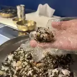 I especially like this kind of Korean seaweed rice balls. Stir them by hand and knead them into rice balls. It's delicious and fun. The rice balls are filled with crab seeds and seaweed. Try to eat them with another piece of roast beef. 😋😋