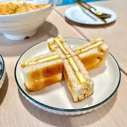 A total of 4 large pieces of crispy toast, sandwiched with large pieces of butter in the middle, plus smooth pandan curry sauce, evil and delicious! 😈