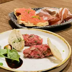The beef is tender and has a bit of bite, with the flavor of onions and chives, accompanied by balsamic vinegar sauce and toast. I like it.