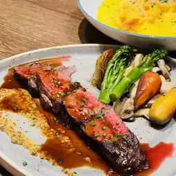 The medium-rare Wagyu beef is rich in flavor and tender inside. It is delicious with chives, mustard sauce, and grilled vegetables. The only seasoning is sea salt, giving you the fresh taste of the vegetables.