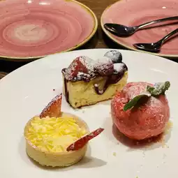 Basque cheesecake with raspberry Italian ice cream. The cake is moist and full of cheese flavor, which matches the sour and sweet taste of ice cream. The cake itself is not too sweet and tastes good.