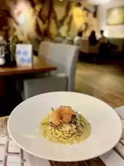 ▶️ Spaghetti with smoked salmon and asparagus white wine sauce $178