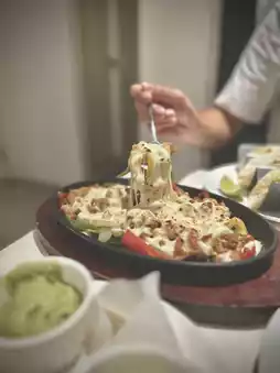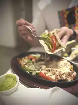 Wrap the filling in tortilla, dip it in avocado sauce and sour cream.