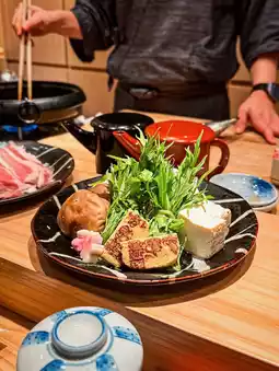Side dishes include Tokyo water vegetables, Akita mushrooms, grilled tofu and bouncy gluten, cooked with sukiyaki sauce, taste sweet😌