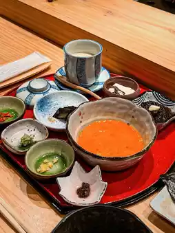 Mixed in two Japanese pearl rice and cooked with kombu, the rice tastes soft and glutinous with kombu fragrance, served with seaweed can increase the taste and flavor, the other bean curd soup tastes just right.