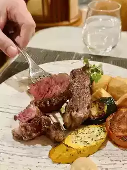 [Grilled Beef Short Ribs] The beef short ribs are tender and rich in meat flavor. We asked for mustard sauce, which gives it a different flavor when dipped in it. Side dishes include baked tomatoes with cheese, melon, potato wedges, etc., which are nutritionally balanced.
