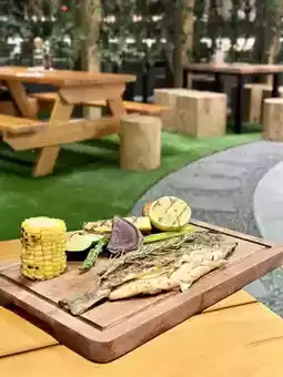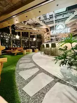 The restaurant is located on the 4th floor of Langham Place and is decorated to match the theme of the restaurant. It is decorated like a campsite with stones, plants and wooden furniture.