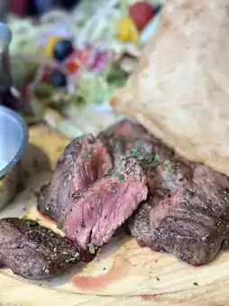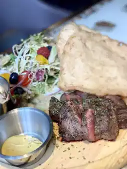 The steak is accompanied by plenty of salad vegetables, the three-cooked dish is done just right. Slightly charred on the outside, keeping the meat tender on the inside. The beef flavor is good enough, basically without ordering sauce is already very tasty. Served with 2 pieces of shrimp chips, this combination is quite innovative, perfect for the afternoon steak mood!