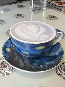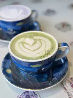 2 cups are selected hot drinks, filled with Van Gogh starry night cup, with heart-shaped latte art, beautiful and photo-taking. Taro is pale purple, matcha is pale green, smooth texture, milky flavor.