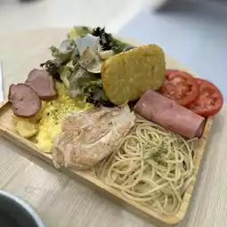 There are 2 different all day breakfasts, $68 and $98, $68 for 5 ingredients, and $98 for 5 designated + 5 self-selected ingredients. There were salads, tomatoes, ham, scrambled eggs, ketchup beans, and I chose egg salad, fries, ham, fried chicken fillets and pasta. It came really super rich, filled the whole plate, after eating really full of Energy all day