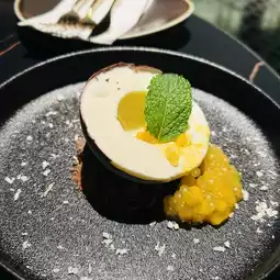 Dessert coconut shell is chocolate wrapped in milk ice cream, with sour mango sago, this combination is quite fresh, the most important thing is very spicy 🤣