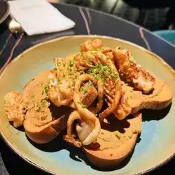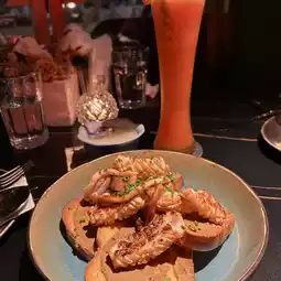 Squid chicken liver sauce with sweet cream toast portion is not much 😳 and very large pieces, squid taste soft and easy to bite, grilled to golden brown crispy toast smeared with fragrant chicken liver sauce 🍞 waiter recommended to eat together, the taste is really good 😻😻😻