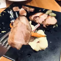 The portion is plentiful, the skin is charred, the meat is rich and the meat is rich in juice. The pear stewed with black vinegar and wine reduces the greasiness. The mashed potatoes are fragrant and smooth with the side dish...