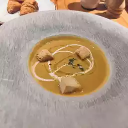 Golden in color, rich in the mouth, plus cream garnish, and served with toasted crispy bread crumbs, delicious, want more bowls.