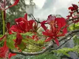 The flower of the Delonix regia has five petals, one of which has yellow and white markings.