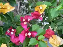The tricolor bougainvillea is colorful, and the small white flowers in the middle are the flowers of the bougainvillea.