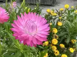 The park is planted with yellow and pink straw daisy, also known as immortelle. Its luster when in bud is really a bit like wax.