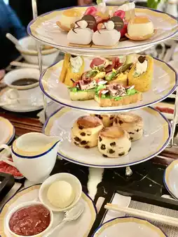A three-tiered tray of sweets, snacks, and scones is served with plenty of clotted cream and jam.