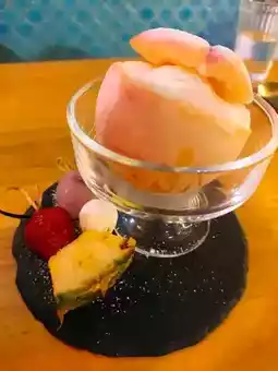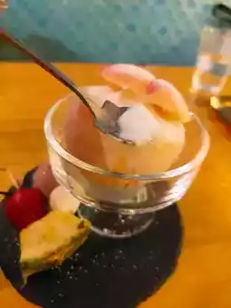 This dessert is definitely a surprise. The chef picked out the pulp of the whole honeydew, stirred it into puree and then frozen it into syrup, and then brewed it back into the honeydew 𥚃 face. The first bite was quite a surprise , pure natural peach fresh and sweet taste, no additives, sweet and refreshing, every bite is iced peach juice, summer refreshing, then with Japanese wagashi and small balls, strawberry and pineapple as an accompaniment plate, not only attractive, the focus is the original flavor, is definitely a summer boon ~