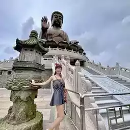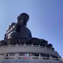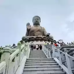 After getting off the bus, walk along the Ngong Ping Market and you can see the 34-meter-high, 250-tonne Buddha statue sitting on top of Mu Yu Peak in the distance Cast from 200 pieces of copper, the majestic and peaceful face of the Buddha shines in the sunlight.