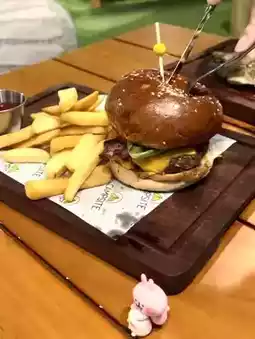 The burger is quite big! The hamburger steak is juicy and served with bacon, cheese, lettuce, tomato and special sauce.