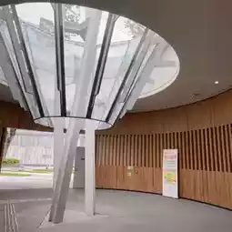 The redevelopment of West Lau Kok Garden in Tsuen Wan District with innovative design includes "raising" half of the park to build a platform garden and an activity center under the platform. The indoor activity space is decorated with wooden strips on the walls and screens, giving a natural, soft and comfortable feeling.