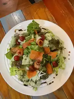 The portion is also generous, with three or more salads. In the middle is a simple and healthy vegetable salad with smoked salmon, drizzled with olive oil and balsamic vinegar, which is a very appetizing appetizer.