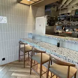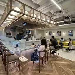 There are bar tables and floor-to-ceiling glass windows for booths🪟