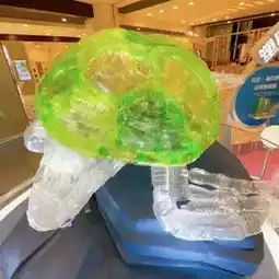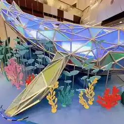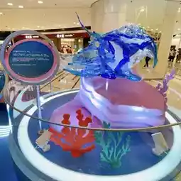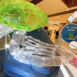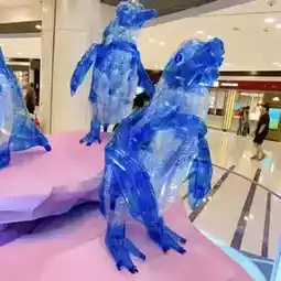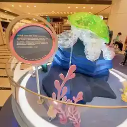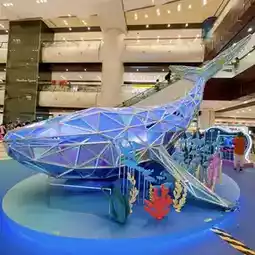 Once you step into the atrium on the first floor of Tsing Yi City Phase 1, you will see a super giant 6-meter-long whale, which is very beautiful. It is made of recycled plastic broken into rPET wire and made with 3D printing technology with different lighting effects. There are also a range of marine life made from recycled plastic bottles, including green sea turtles, penguins, and ghost manta rays.