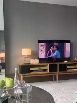 The room is well-equipped and very comfortable. The large blue sofa is very elegant.