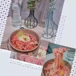 This spaghetti is thin pink spaghetti first time to see so ordered to try the outside of the spring eggs very active L very good 😎 In addition, his carbonara than the usual market is lighter so eat It doesn't feel greasy at all and the pink color is worth ordering to check in 🤣