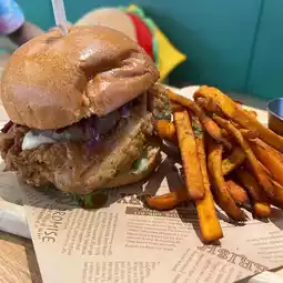 🍔 Extra Crispy Chicken Leg Burger with Sweet Potato Fries