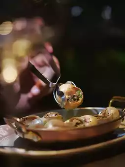 The snails are just baked, and they have a super strong vanilla butter wine white flavor. The snails are plump and juicy, plus the smooth mashed potatoes at the bottom are 10% delicious
