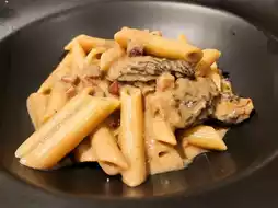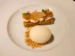 The main course I ordered was penne with Italian-style air-dried pork cheek, paired with delicious morels, which was very satisfying! Served with Parmesan cheese and mushroom sauce, it has an Italian flavor. For dessert, I chose the "Pistachio Cake with Jasmine Tea Cream, Candied Pear and Honey Cake", which was also very sweet and delicious.