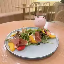 Starter Peach, Parma ham, buffalo cheese salad Half white earth oil and vinegar sauce is beautiful 🤩 Salad is sweet and sour, Parma ham large pieces, a lot of portions and delicious Peach blossom pink is fantastic, drink heavy milk flavor, moderate sweetness Great for photography
