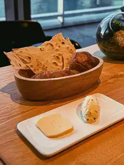 The staff first served 3 kinds of bread, paired with truffle butter and cream cheese, the most like with onion cream cheese, with bread is very tasty, another package comes with a glass of selected house wine😌