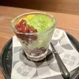 The dessert is made with Kyoto Uji tea ceremony grade matcha. The dessert is made with honey-flavored red bean paste and soft white dango, which has a rich matcha flavor and a soft and smooth texture.