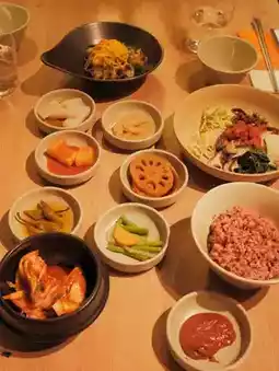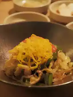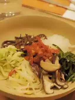 🤣Two large bowls of brown rice are served (you can ask the staff for only one bowl), accompanied by a colorful plate of assorted vegetables🥬: bean sprouts, spinach, wood ear, mushrooms🍄,🧅 onions, shredded zucchini, etc., and then Korean spicy sauce is added to the rice, which is crispy and flavorful, and very filling👍🏻.