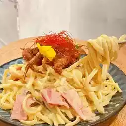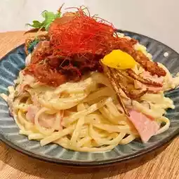 The carbonara pasta is paired with ham and mushroom slices, the soft shell crab is fried whole, and the crab legs have meat to eat.