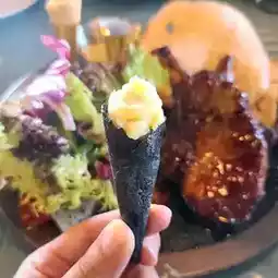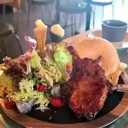 The pork chop is very soft and tastes a bit like Hong Kong-style barbecued pork. The sauce is sweet. There is a lot of sesame salad on the side. There are two sweet potato cones in the middle. The lemon juice tastes sour and very appetizing.