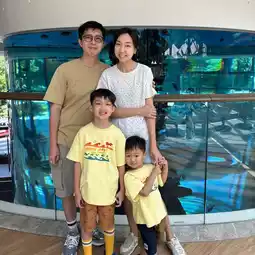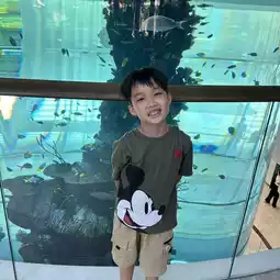 🐠 Once we arrived, we were attracted by the giant fish tank in the hotel lobby, and encountered the time of divers feeding the fish, several little boys were excited to watch.